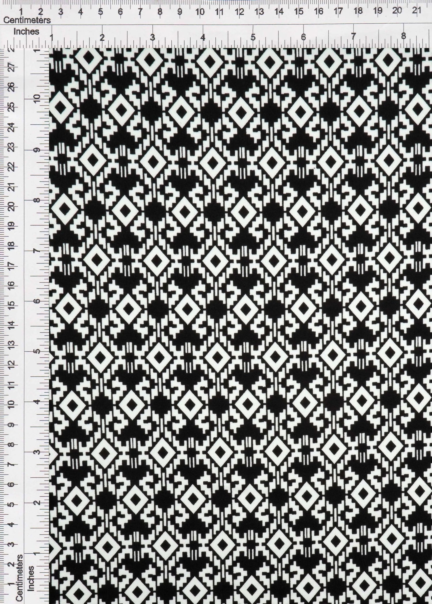 This DTY (Drawn Textured Yarn) knit fabric features a stylish geometric print on a soft, smooth surface. The midweight construction and 4-way stretch make it a perfect choice for fashion and everyday wear including dresses, tops, leggings, and activewear.