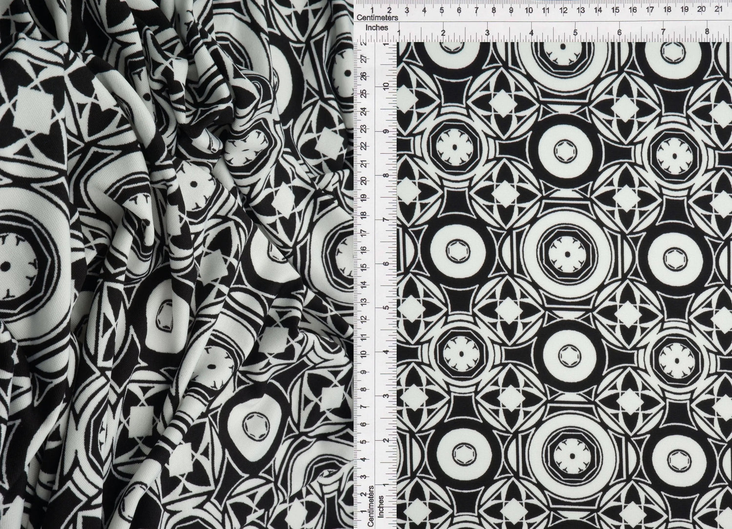 Lightweight and soft DTY knit fabric with a trendy geometric print. Made of 96% polyester and 4% spandex, this fabric has a comfortable 190 GSM weight and a 58/60 inch width, offering a smooth feel and flexible stretch. Perfect for creating fashionable tops, skirts, dresses, leggings, or unique DIY craft items. Sold by the yard to suit any sewing idea.