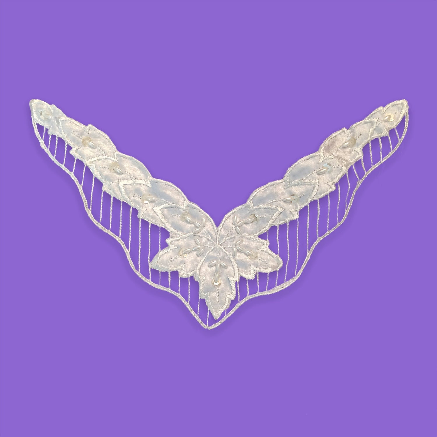 This high quality handmade beaded lace applique is embroidered on durable, heavy weight 100% polyester satin. Perfect for adding elegance to wedding dresses, evening gowns, dance costumes, quinceañeras, and more.