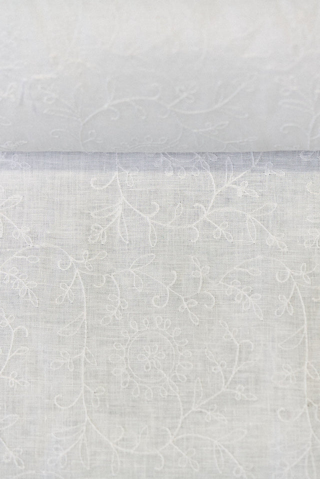 Add exquisite detail to your next project with our Pure Linen Tile Flower Embroidered Fabric in pristine White. This beautiful textile features delicate tile flower embroidery across its surface, creating a sophisticated and unique design. With a comfortable 4 oz/yd² lightweight and a versatile 54-inch width, this flat-weave pure linen offers a crisp finish and elegant drape. It's an impeccable choice for crafting luxurious apparel, decorative overlays, or distinctive home accents that demand intricate design and natural quality.