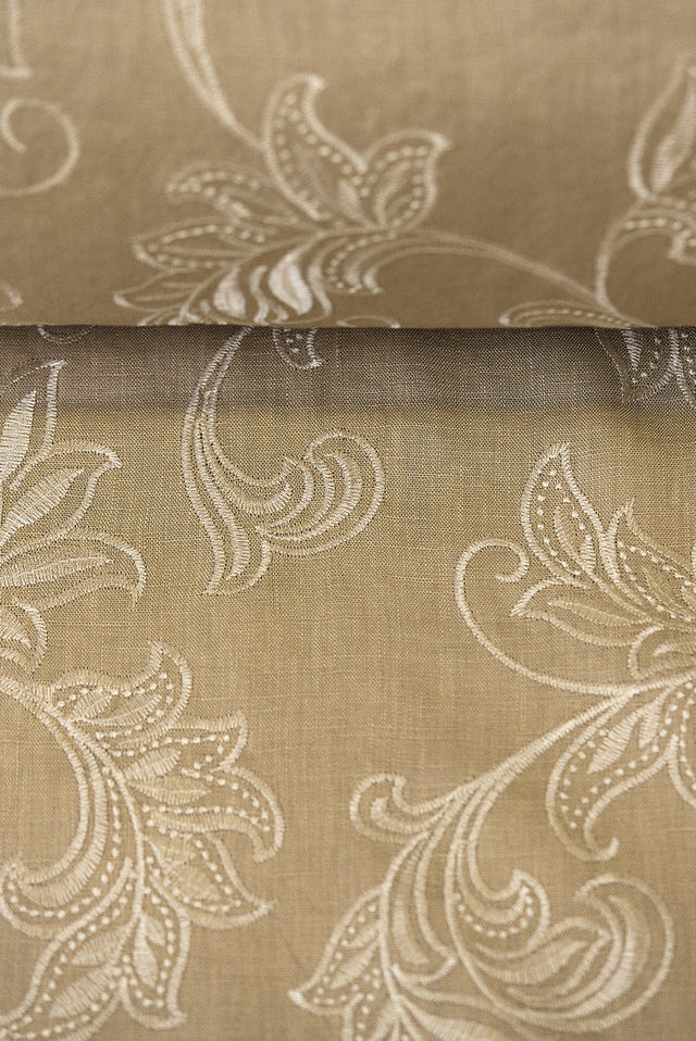 This pure linen fabric features an elegant foliage embroidery in natural and ivory tones, offering timeless appeal with an organic touch. With a midweight feel at 5.5 oz per square yard, it is ideal for creating refined garments, window treatments, and upscale table linens. The 54-inch width ensures enough coverage for larger sewing projects with minimal seams. Its flat woven base enhances the embroidery detail while maintaining a clean, breathable, and smooth surface.