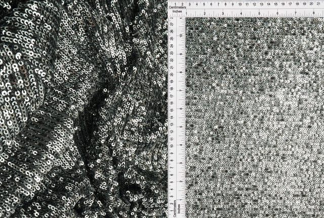 This silver embroidered knit fabric features a soft polyester and spandex blend with intricate embroidery details, offering a light stretch and elegant texture. Ideal for overlays, special occasion dresses, blouses, and decorative accents, this fabric provides a shimmering finish. Sold by the yard, it measures 50 to 57 inches wide.