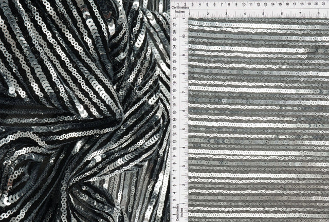 This black and silver embroidered knit fabric is crafted from a blend of 93% polyester and 7% spandex, featuring intricate embroidery in shimmering silver on a deep black base. With light stretch and a soft hand, it is perfect for overlays, evening wear, blouses, and decorative fashion accents. Sold by the yard, the fabric measures 50 to 57 inches wide.