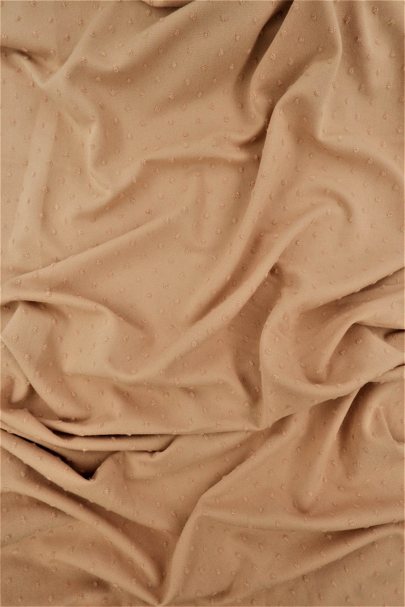 This knit jacquard fabric features a delicate Swiss dot pattern with a soft texture and gentle stretch. Made from 77% polyester and 23% rayon, it weighs 200 GSM and measures 58/60 inches wide. Ideal for sewing elegant and lightweight garments such as blouses, dresses, and overlays. Sold by the yard, this fabric combines breathable comfort with subtle texture for versatile apparel.