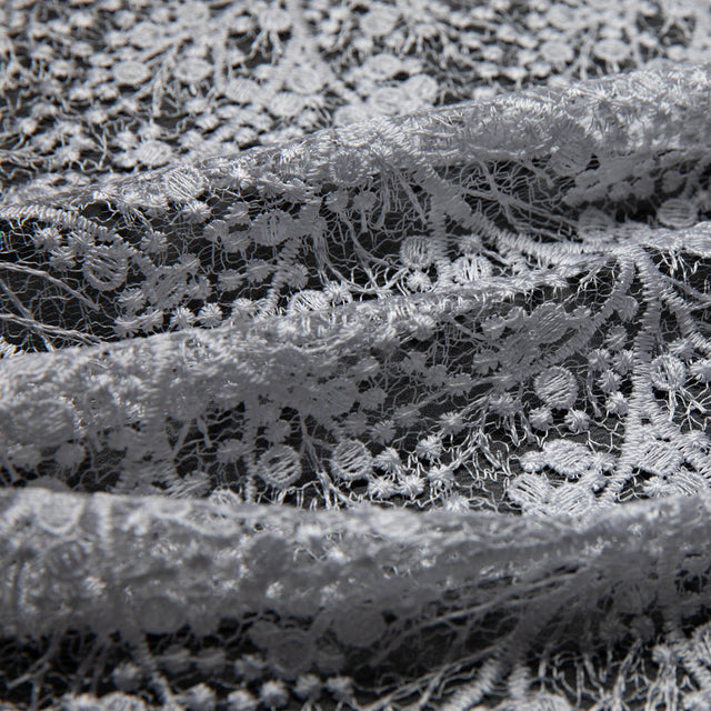 This stunning Spider Mesh Lace fabric, measuring 52 inches wide, features an intricate and delicate embroidered pattern. The unique spider mesh base adds a modern and edgy touch to the traditional lace design, perfect for a variety of creative projects.