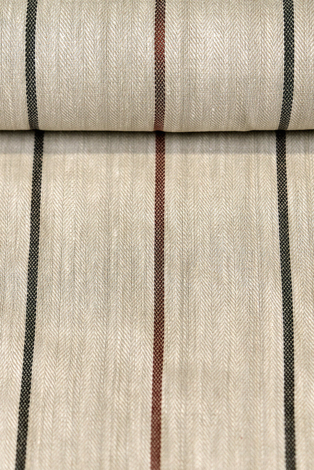 Infuse your creations with the warm glow of our Linen Novelty Herringbone Yarn-Dyed Stripe Fabric in a captivating Copper hue. Skillfully crafted in India, this high-quality pure linen textile features a sophisticated herringbone weave subtly enhanced with a refined yarn-dyed stripe, offering a timeless and classic aesthetic. With its versatile 54-inch width and a comfortable 5.5 oz/yd² midweight, this fabric provides both excellent drape and enduring quality. It's an impeccable choice for any crafting or sewing project, destined to infuse your creations with a touch of understated luxury and classic appeal.