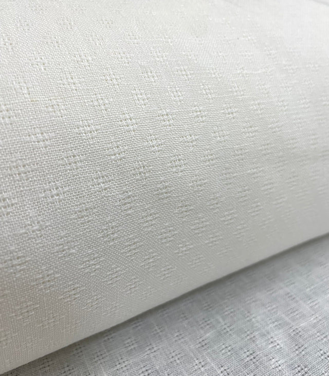 Discover the subtle sophistication of our Pure Linen Diamond Jacquard Fabric in an elegant Ivory hue. This exquisite material boasts an intricate interwoven squares jacquard weave, creating a beautiful diamond-like pattern that adds refined texture to any project. At a delicate 4 oz/yd² lightweight and a generous 60-inch width, this flat-weave linen offers a crisp finish and graceful drape. It's an impeccable choice for crafting luxurious apparel, delicate overlays, or unique home accents, bringing a touch of understated elegance and quality to your creative endeavors.