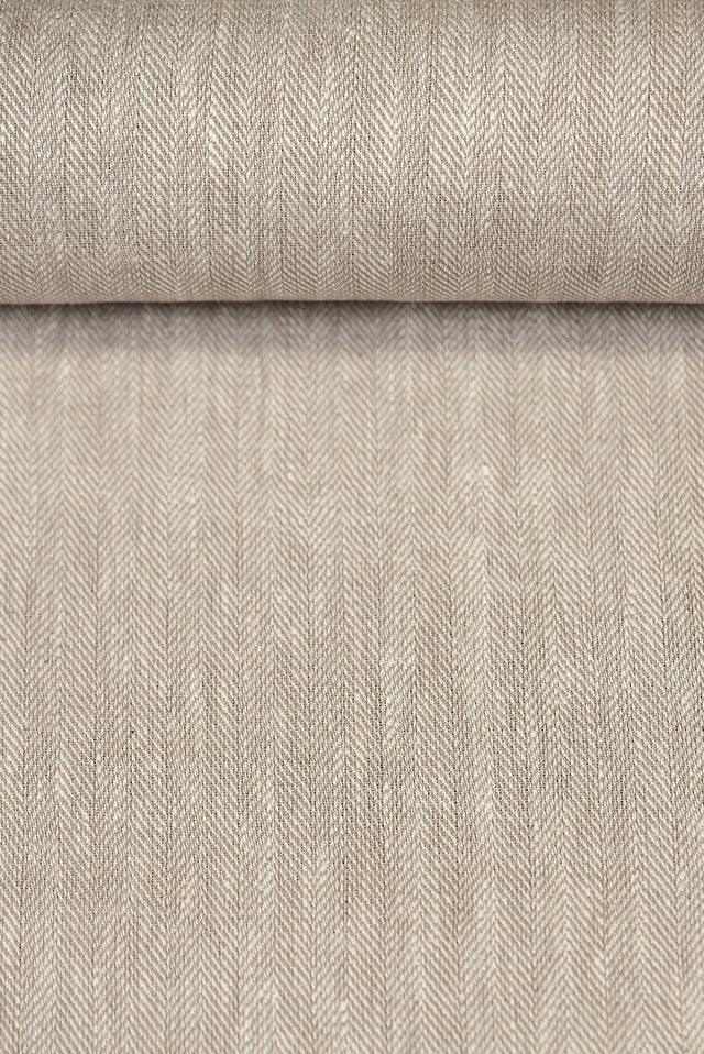 • Midweight 5.5 oz per square yard pure linen featuring a yarn-dyed herringbone pattern in a warm buff color