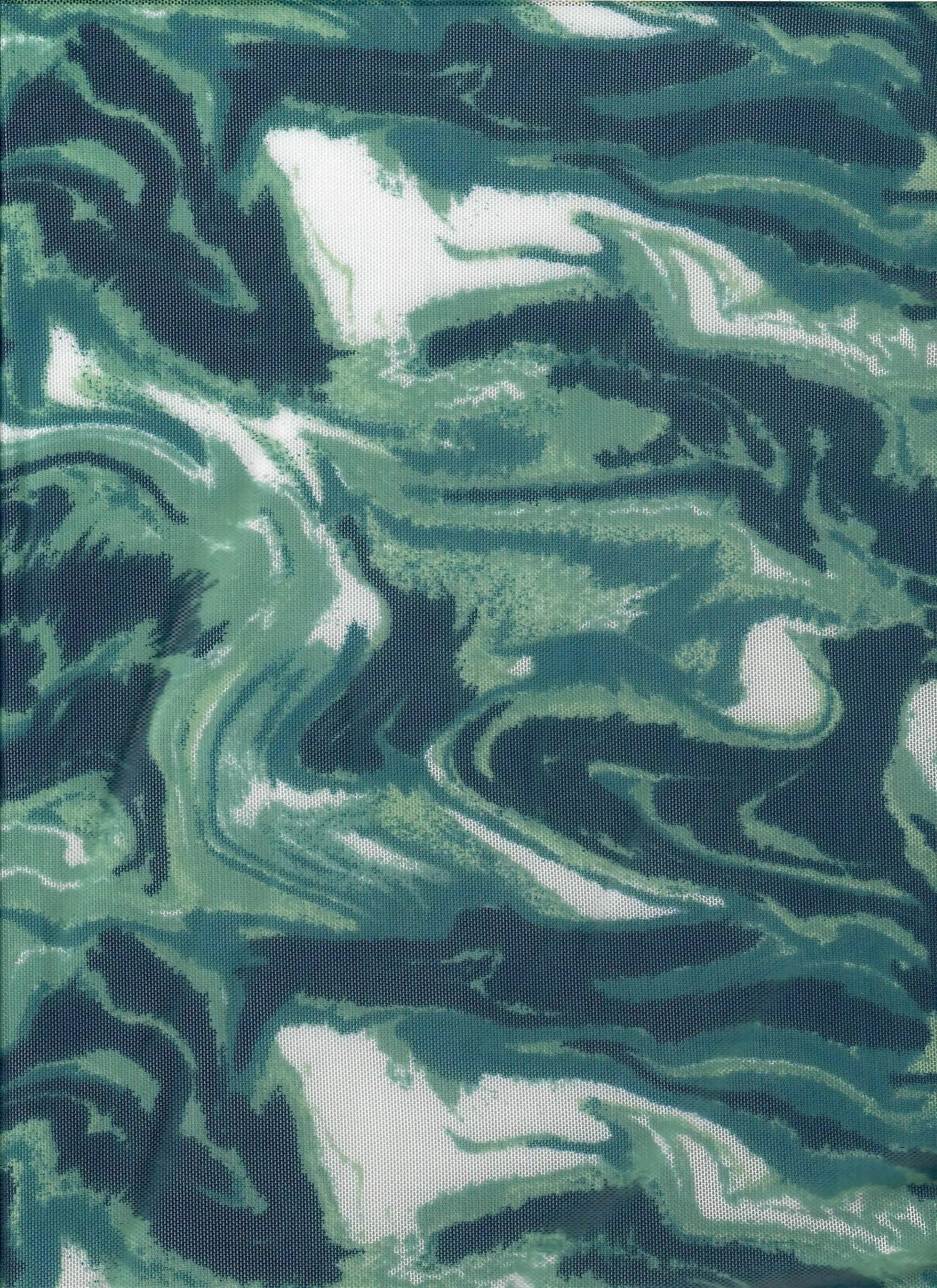 This lightweight mesh knit fabric features a unique blend of marble and abstract digital prints on a breathable, flexible surface. Made from a 90% polyester and 10% spandex blend, it offers excellent 4-way stretch and a fluid drape perfect for layering, activewear, performance costumes, and bold fashion pieces.