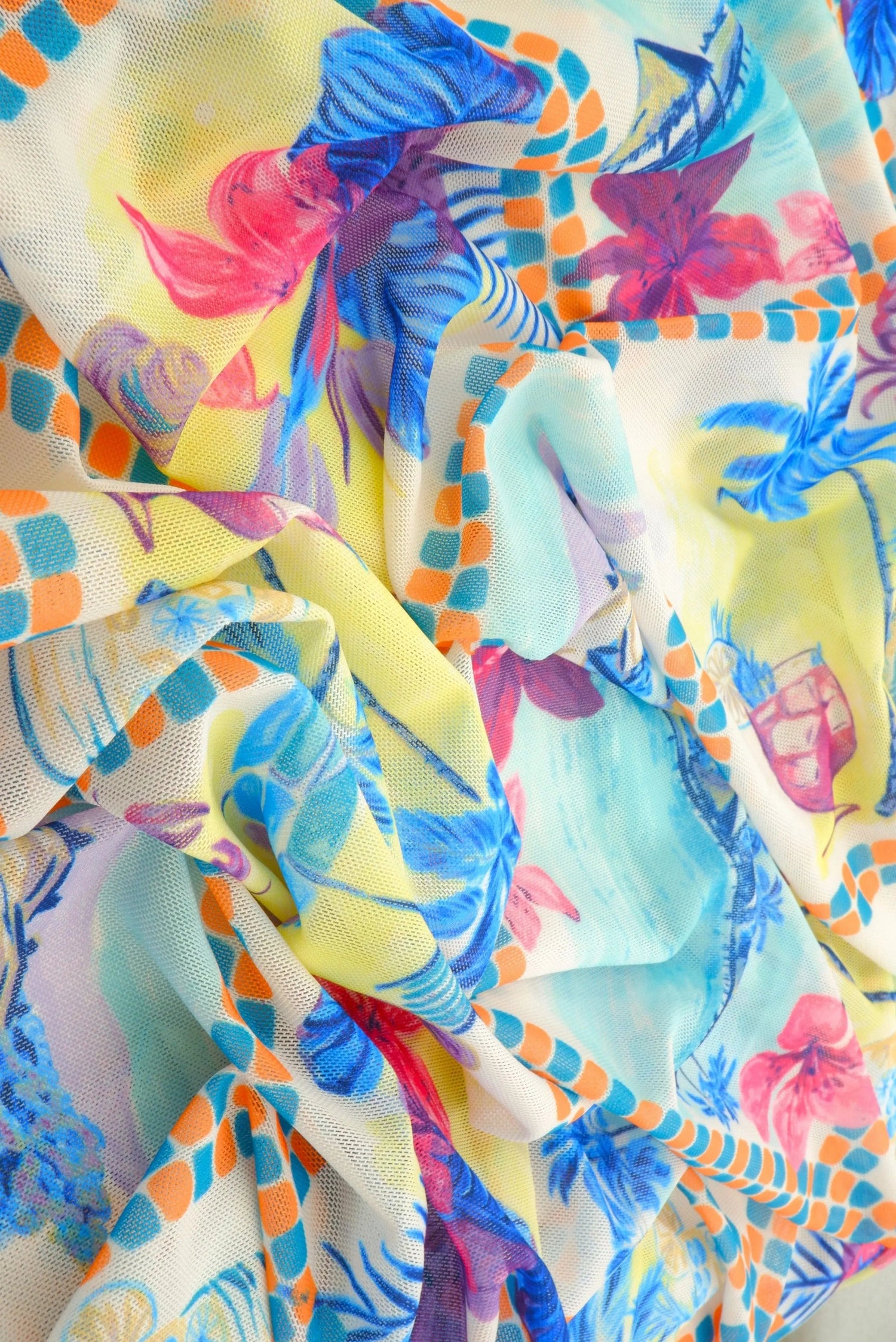 This medium-weight mesh knit fabric features a vibrant digital scenery print on a breathable and flexible surface. Made from 90% polyester and 10% spandex, it provides excellent 4-way stretch and a smooth drape ideal for fashion overlays, performance wear, and standout design projects.