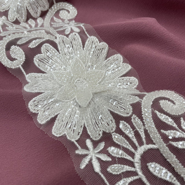 1 Yard Beaded 3D Floral Lace Trimming Embroidered on 100% Polyester Net Mesh 3.5" Wide
