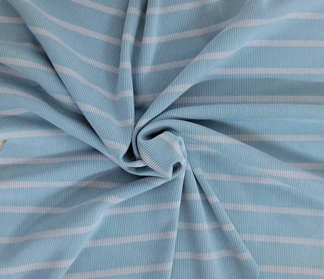 This Blue Stripe 1x1 Rib Knit fabric combines nylon and spandex for excellent stretch, structure, and recovery. The ribbed texture and stripe pattern give it a stylish finish, while the durable nylon spandex blend makes it ideal for applications that require flexibility and elasticity. Perfect for finishing edges on garments like cuffs, collars, waistbands, and also suitable for sporty tops, athleisure, and fitted apparel.