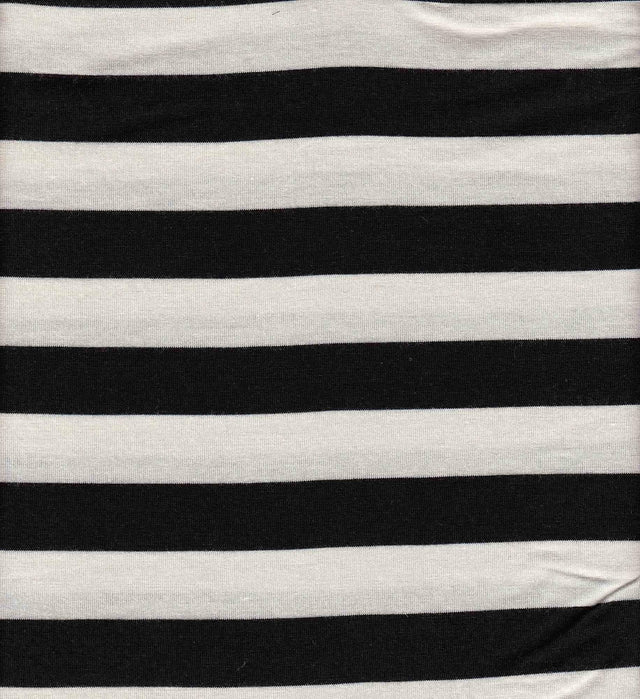 This 1 yard Rayon Span Fabric features a stylish 1" stripe pattern in black and ivory, made from 96% rayon and 4% spandex. With a fabric width of 58/60 inches and a GSM of 180, this fabric is ideal for creating comfortable and chic apparel such as t-shirts, dresses, and casual tops. The yarn-dyed stripes ensure vibrant and lasting color, making this fabric both functional and fashionable.