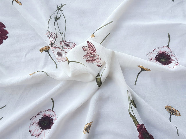 1 Yard White Rayon Crepe Fabric With Multicolor Floral Print Drapey Soft Material For Dresses