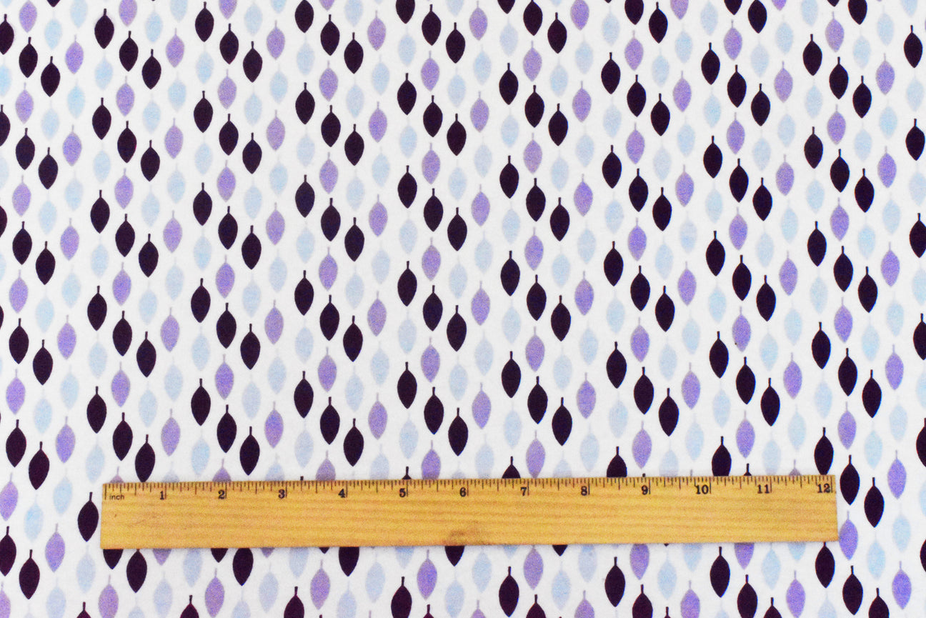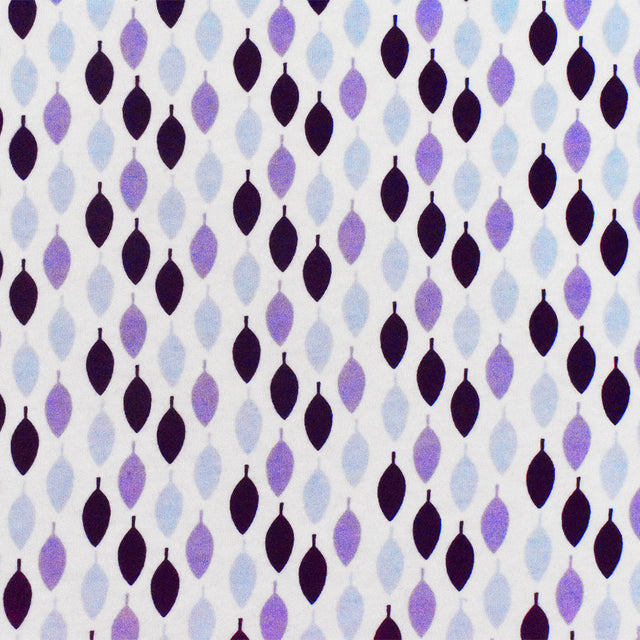 This cotton-spandex stretch jersey knit fabric features a charming multi-color leaf pattern in hues of white, baby blue, purple, and dark purple. Designed for lightweight comfort with a soft touch, it delivers excellent four-way stretch and an opaque finish. Perfect for crafting stylish activewear, comfortable blouses, dresses, and dancewear, this fabric drapes nicely and moves with you for all-day wearability.