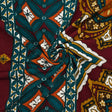 • Moroccan border inspired print in deep maroon red deep teal orange brown ivory and dijon yellow adds exotic style