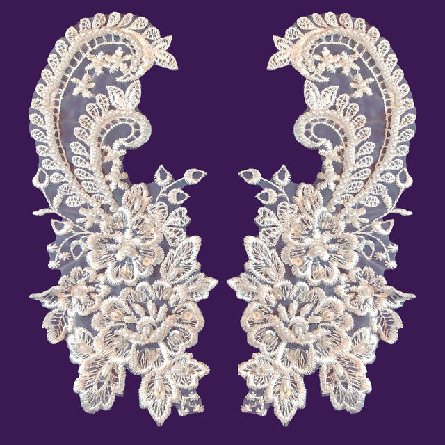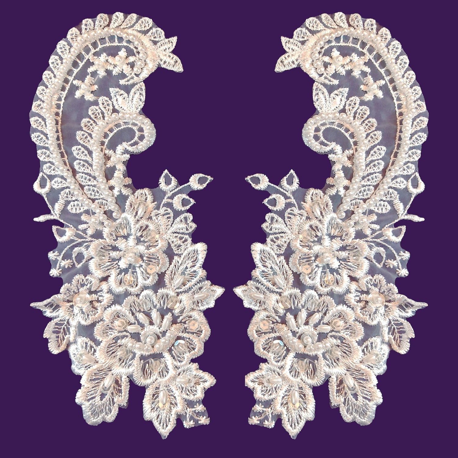 This exquisite handmade beaded bridal lace applique is beautifully embroidered on high quality polyester organza, accented with pearls and sequins for added elegance. Perfect for wedding gowns, communion and flower girl dresses, dance costumes, home décor, and DIY projects, this applique is sold in symmetrical pairs to ensure a balanced and refined finish.