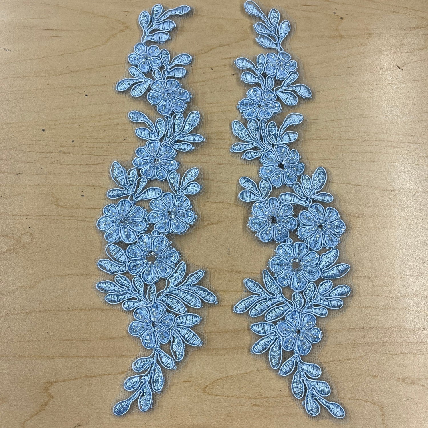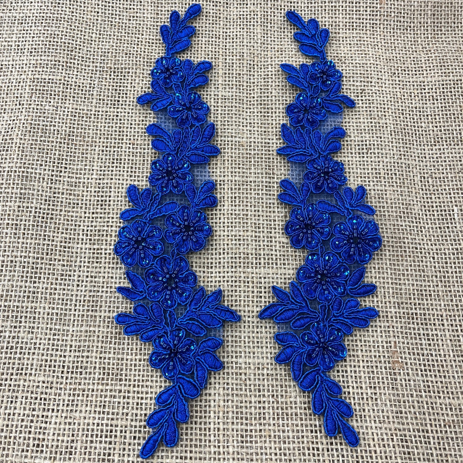 1 Pair 9.5" x 2" Each Side Beaded & Corded Floral Lace Applique Embroidered on 100% Polyester Net Mesh