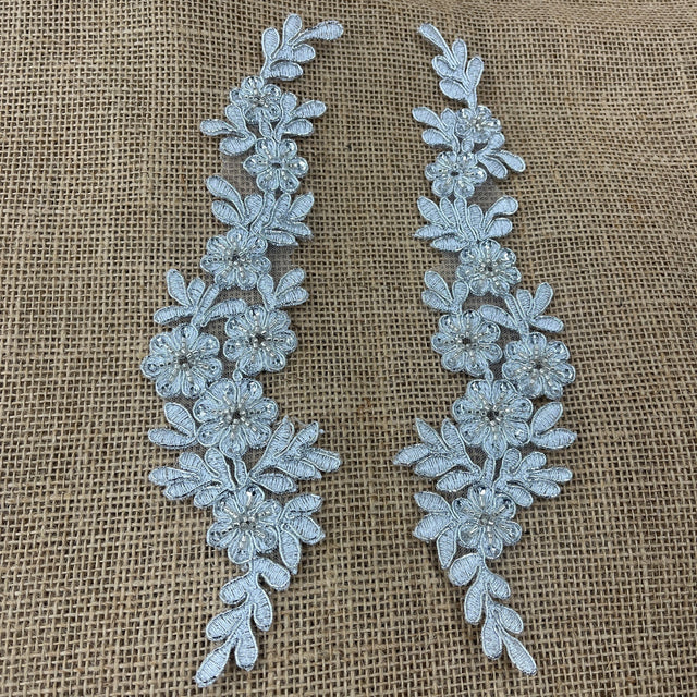 1 Pair 9.5" x 2" Each Side Beaded & Corded Floral Lace Applique Embroidered on 100% Polyester Net Mesh - Metallic Silver is backordered and will ship as soon as it is back in stock.