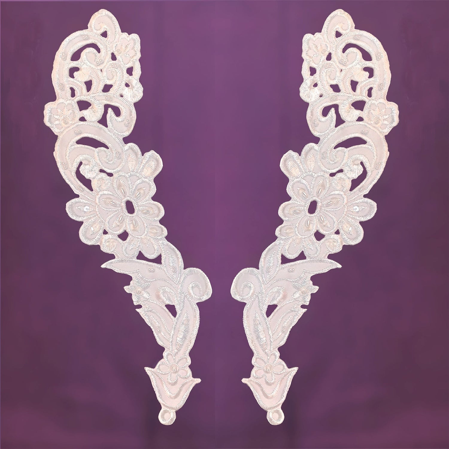 1 Pair Handmade Beaded Lace Applique on Satin for Bridal & Baptism 12.25" x 3.25" Each Side
