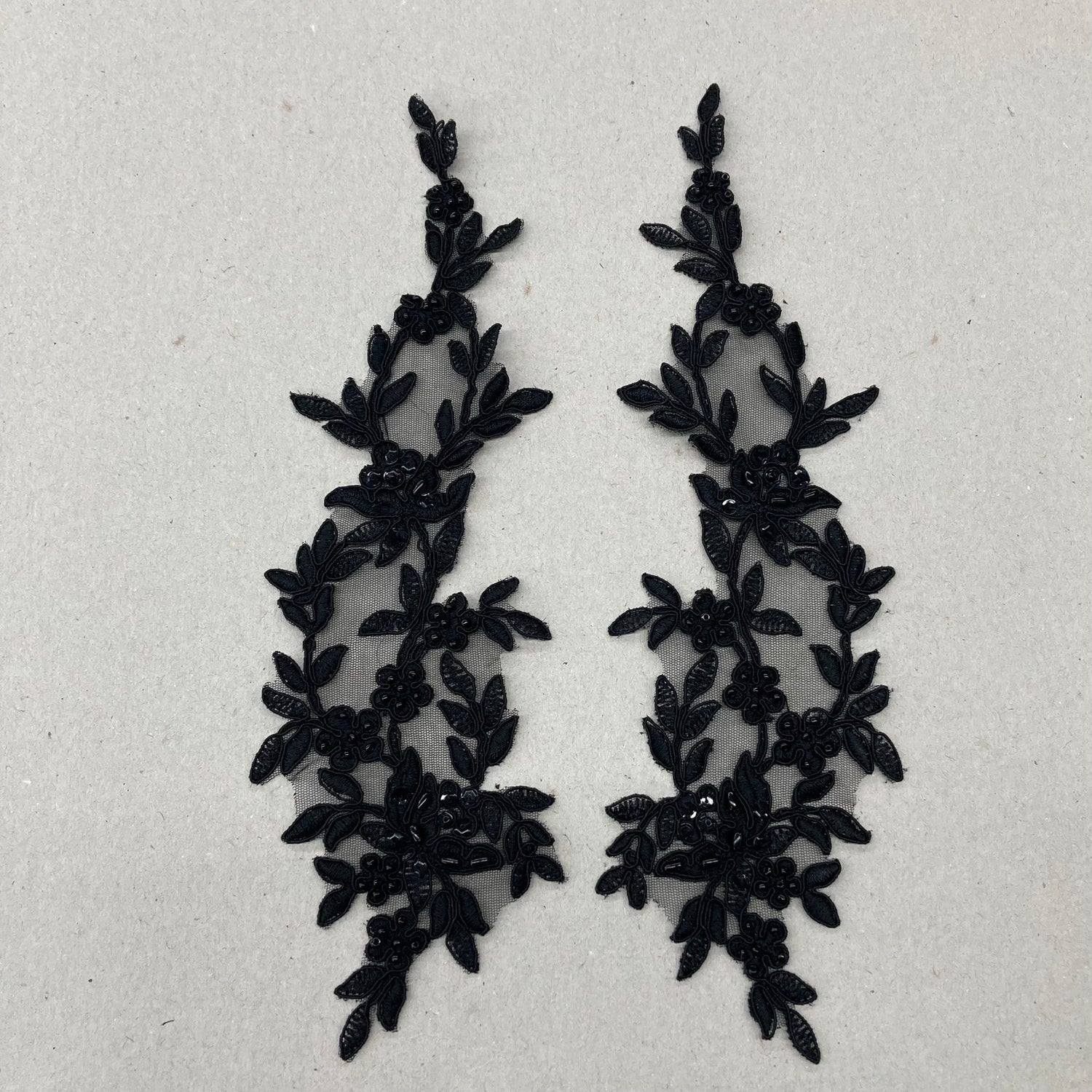 1 Pair Beaded & Corded Floral Lace Applique 13" x 4" Each Side - Black is backordered and will ship as soon as it is back in stock.