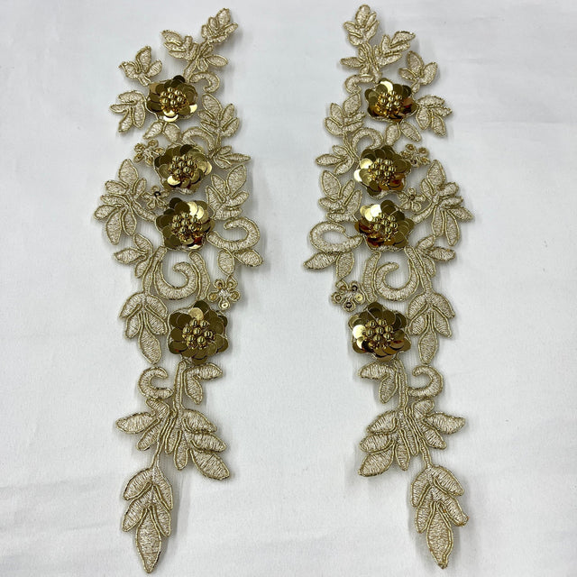 1 Pair 11" x 3" Each Side Beaded & Corded Floral 3D Lace Applique 100% Polyester Net Mesh - Gold is backordered and will ship as soon as it is back in stock.