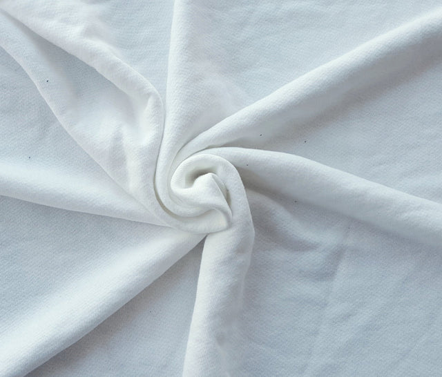 This Off White Cotton French Terry Knit Fabric offers a plush and cozy texture ideal for casual wear and loungewear. Made from 100% cotton, this medium heavy weight fabric at 350 GSM provides warmth, breathability, and durability. The classic French terry loopback knit adds softness on the inside with a smooth exterior, making it perfect for sweatshirts, hoodies, and relaxed apparel. The versatile off white color ensures effortless styling for everyday comfort.
