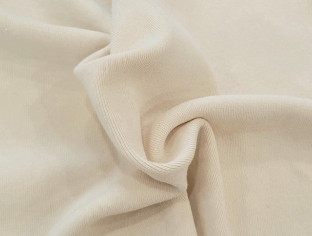 This natural colored 1x1 rib knit fabric blends prewashed cotton and spandex for superior softness, stretch, and durability. Weighing 600 GSM, it is a heavyweight fabric ideal for structured yet comfortable garments like sweatshirts, cuffs, and fitted tops. The ribbed texture adds visual interest and enhanced recovery, ensuring garments retain shape through wear.