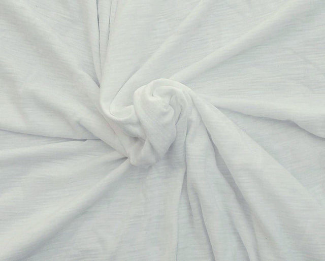 This white cotton slub jersey knit offers breathable comfort with a subtle textured surface and lightweight drape. Ideal for t shirts, dresses, and layering, it features a naturally soft hand and slight stretch. Its 190 GSM weight makes it perfect for warm weather wear and DIY fashion projects. Sold by the yard and shipped in a continuous cut when multiple yards are ordered.