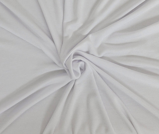 This white 2x1 rib knit fabric combines soft modal and flexible spandex for a breathable, stretchy finish perfect for fitted garments. The vertical ribbed texture adds visual depth and a snug, flattering fit for tops, dresses, and layering pieces. Designed for everyday comfort, it drapes beautifully while maintaining excellent shape retention through wear. Its clean white color makes it versatile for seasonal fashion, DIY apparel, or performance wear.