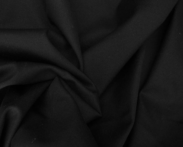 1 Yard of heavyweight Black Cotton Twill Spandex fabric featuring a durable diagonal weave and subtle stretch. Made from 98% cotton and 2% spandex, this 250 GSM fabric offers comfort and flexibility for tailored garments and utility wear. Its deep black tone and sturdy structure make it ideal for pants, uniforms, jackets, skirts, and fitted dresses.