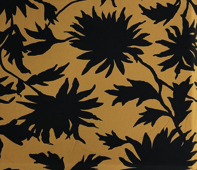 - Rich gold and black floral print on soft, stretchy rib knit fabric.