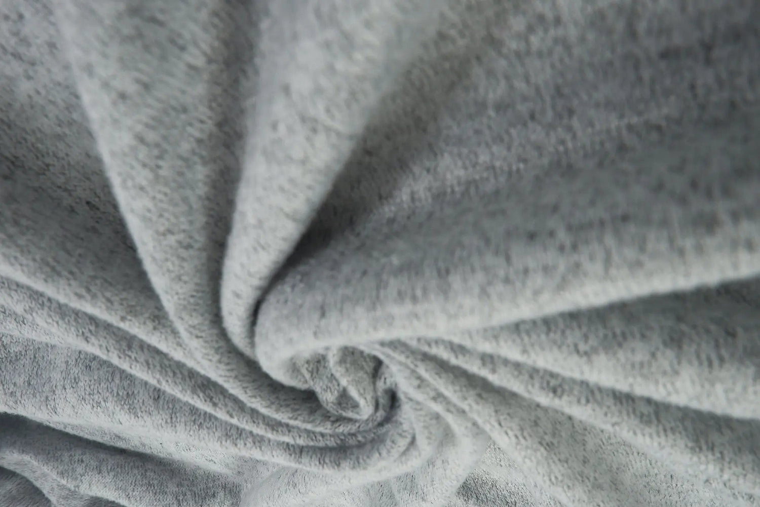 This super soft hacci stretch knit fabric in heather grey offers a cozy and comfortable feel with excellent stretch and recovery. Made from 96% polyester and 4% spandex, it is ideal for crafting loungewear, sweaters, cardigans, and casual tops. Measuring 58/60 inches wide with a GSM of 180, this medium-weight fabric is sold by the yard and perfect for versatile, breathable apparel projects.