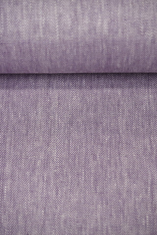 • Midweight 5.5 oz per square yard pure linen with yarn-dyed herringbone weave in a soft lilac color